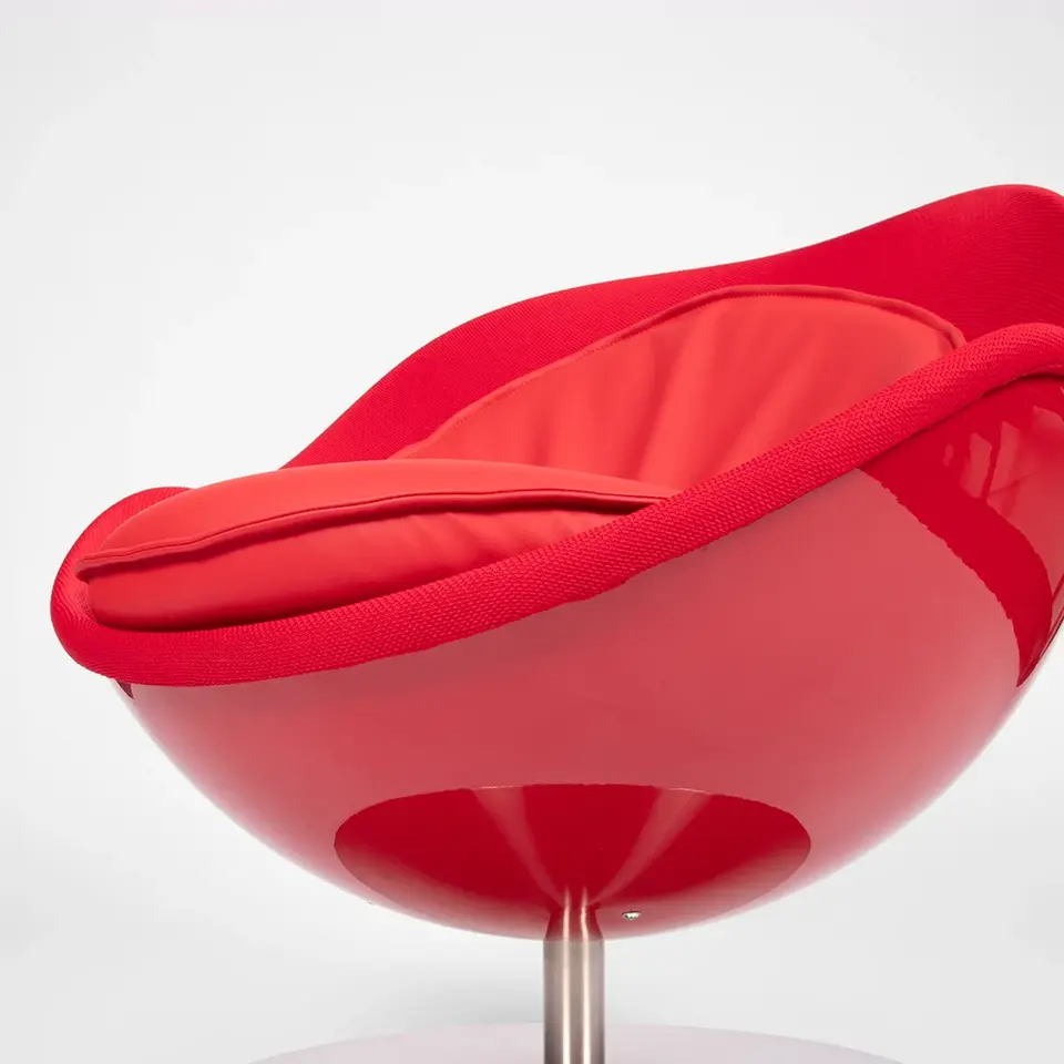 Außen aus glänzend-glatter High-End-Kunststoff im Billardkugel-Design, innen bequem gepolstert. Die glatte Oberfläche reflektiert minimalistisches Design, während die runde Form an die ikonischen Ball Chairs der 1960er Jahre erinnert – ein Statement für moderne, sportlich-elegante Interieurs.